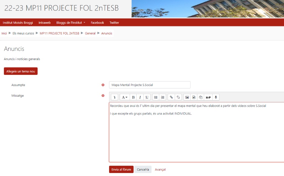 - una és un correu a una de la persona que s’encarrega del moodle de l’institut i en aquests moments també fa tasques de coordinadora TAC