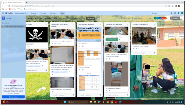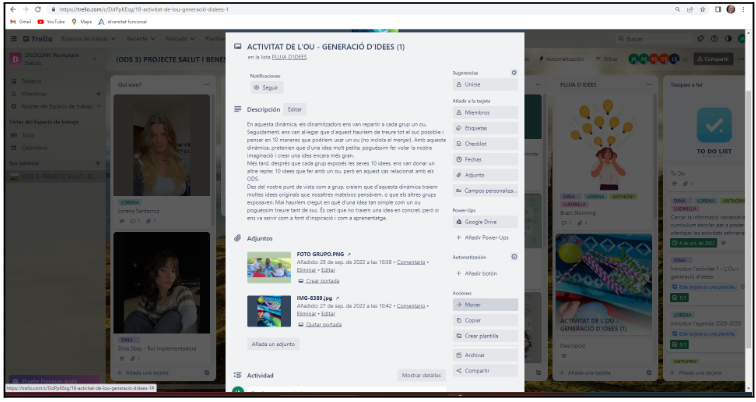 Aquí podem observar quan comencen a iniciar les tasques, consulten entre ells i prenen decisions de com continuar. Sempre utilitzant les eines del Trello per fer-ne el seguiment i la carpeta drive per anar elaborant el material.