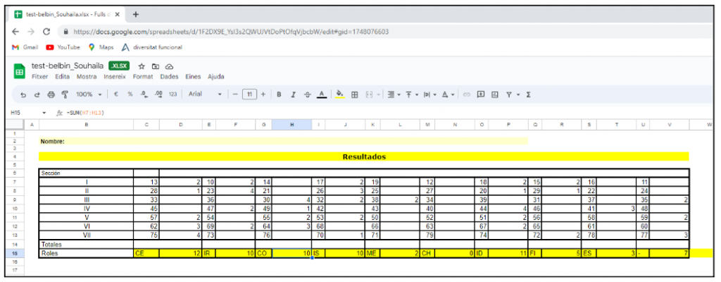 Fase 1: Test de Belbin. Aquí podem veure els resultats d’un test realitzat per una alumna.