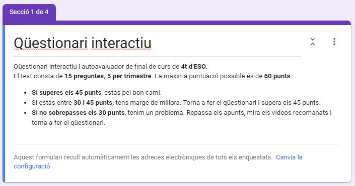 Aquesta vegada, proposo un qüestionari interactiu i autoavaluatiu per a final de curs de 4t d’ESO. És fet amb Google Formularis. Els formularis són una eina útil per recopilar informació i atendre a la diversitat. Aquest consta de 15 preguntes, 5 per trimestre.