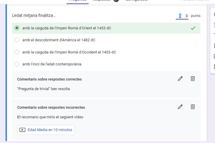 - Atenció a la diversitat i personalització. El formulari de Google m’ha permès afegir vídeos, presentacions i comentaris. Aquest fet enriqueix l’experiència de l’alumnat, en facilita la comprensió dels conceptes i en facilita la personalització.
