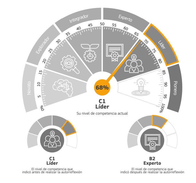 Després de l’autoavaluació, s’ha determinat que el nivell de competència digital docent actual se situa en un 68%, la qual cosa correspon al nivell C1, però just superat el nivell B2 o expert, que sembla més realista en aquest cas. El resultat assolit indica un coneixement profund i una aplicació crítica i reflexiva de les tecnologies digitals en la pràctica docent.