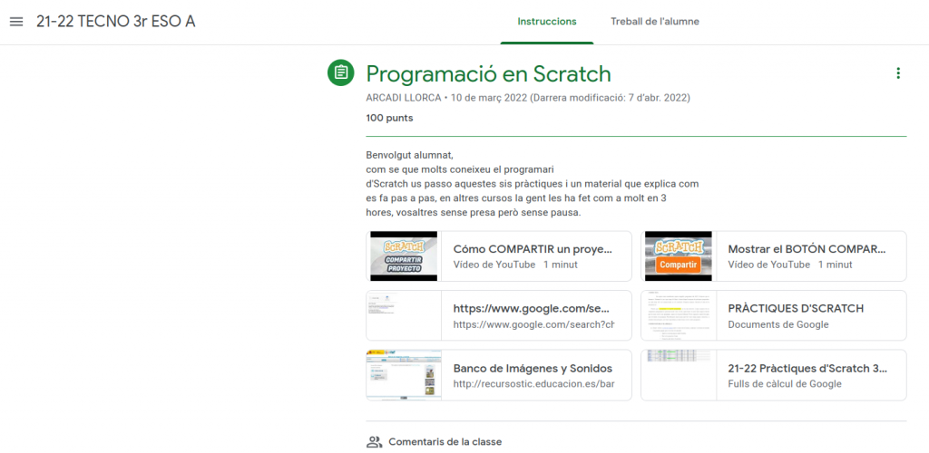 He realitzat una activitat de programació en Scratch que he penjat al Classroom: