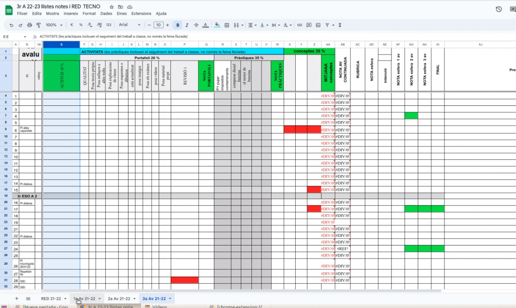 Una vegada tinc les evidències de les feines lliurades per l’alumat, prefereixo utilitzar el meu quadern de càlcul realitzat amb un full de calcul, l’extensió corubrics,..