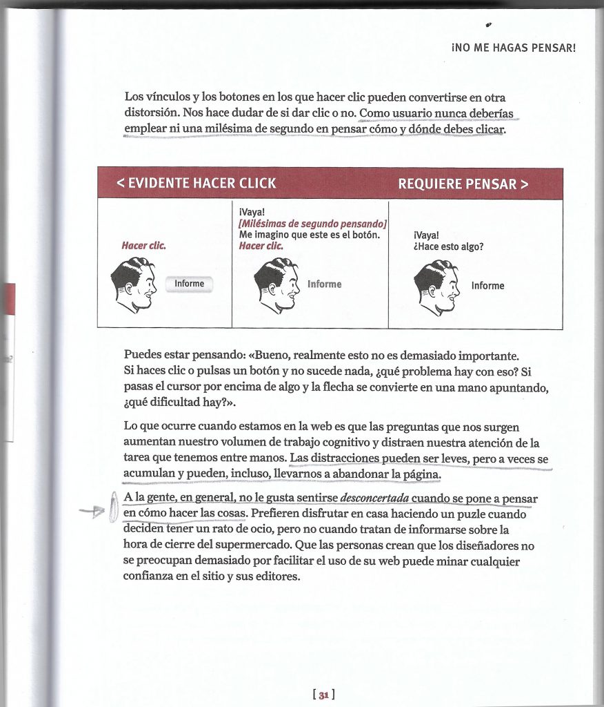 Rellegeixo aquest llibre un cop l’any per no perdre de vista els fonaments de la usabilitat web. Krug remarca, amb un estil molt proper i clar, que hem d’evitar les ambigüitats i no fer pensar innecessàriament al lector del nostre web.