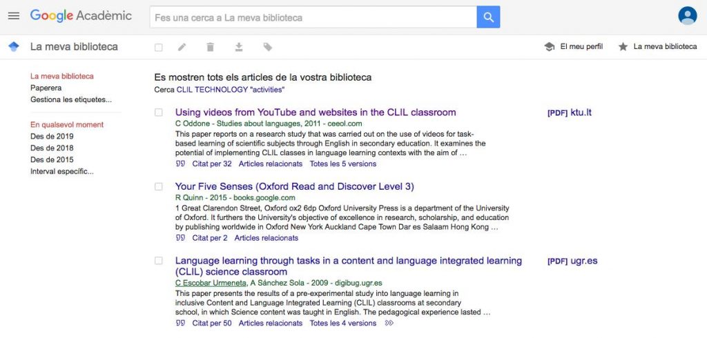 A l’activitat 2 hem visitat la web Google Acadèmic (https://scholar.google.es/schhp?hl=ca) . Desde la Cerca Avançada he fet tres cerques diferents sobre temes que m’interessen relacionats amb les àrees CLIL, les SCIENCE, i l’ús de la TECNOLOGIA en les àrees CLIL. Els enllaços m’han portat a articles, llibres de google books, documents PDF,… Des les cerques que he fet, he assenyalat les més interessants per a mi i les he desat a la meva biblioteca. Posteriorment, n’he escollit tres de diferents: un article reflexiu, un llibre sobre “Your five senses” i un estudi en format pdf sobre l´ús de YouTube a les àrees CLIL.