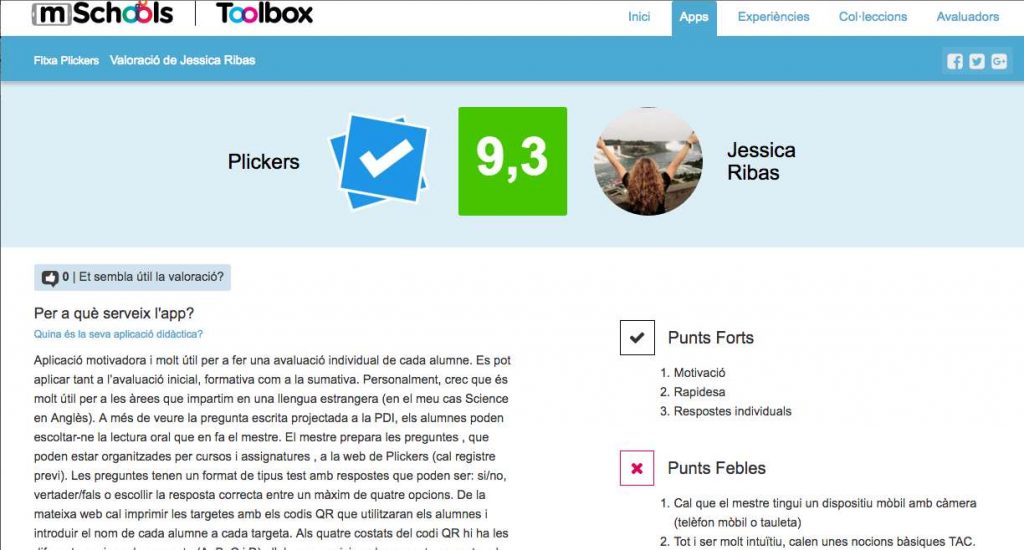 En la primera activitat, hem treballat a l’entorn Toolbox, on ens hem registrat i hem fet l’avaluació d’una App. Jo he valorat una aplicació que utilitzo molt sovint i que trobo molt motivadora per als alumnes, l’App PLICKERS (www.plickers.com).