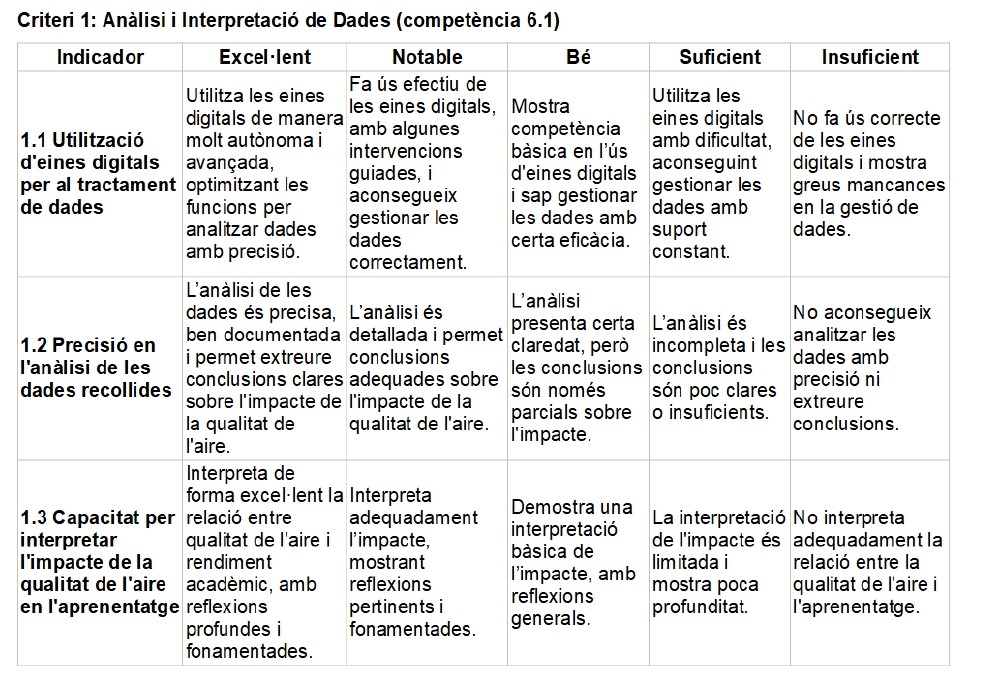 - Anàlisi i Interpretació de Dades (competència 6.1): Avaluar la capacitat dels estudiants per recollir, gestionar i interpretar les dades de qualitat de l’aire, seguint indicadors com: