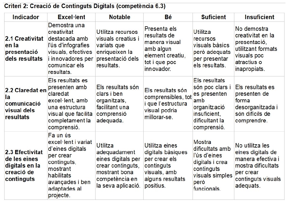2. Creació de Continguts Digitals (competència 6.3): Es valorarà la creativitat i la claredat amb què presenten els resultats, a través d’infografies o altres formats visuals com presentacions digitals.