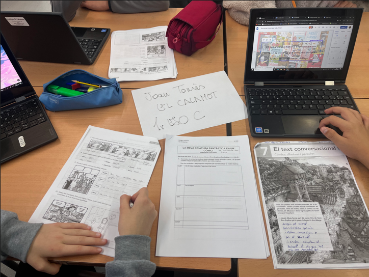 Estem treballant a l’aula la teoria del còmic amb un dossier fotocopiat on es defineix el còmic, s’explica què és un text conversacional, es defineixen els principals elements d’un còmic… Com a tasca final de la unitat els alumnes han d’elaborar un còmic sobre una criatura fantàstica protagonista d’alguna llegenda popular catalana. Per fer-ho també s’ajuden d’un document on hi ha una guia amb els passos a seguir per estructurar bé el plantejament i desenvolupament d’un còmic.