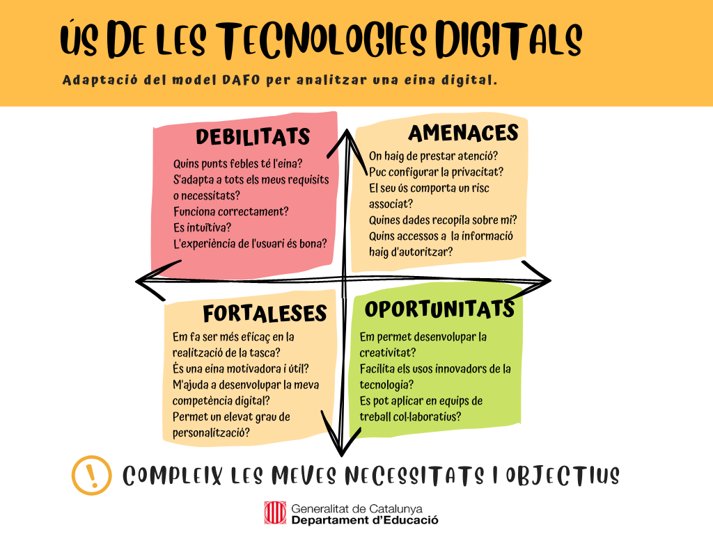 En aquesta activitat treballarem l’ús de les tecnologies digitals per dur a terme projectes individuals i col·lectius. Es demanarà als alumnes que utilitzin els seus coneixements tecnològics i digitals previs per elaborar un podcast, penjar-lo i enllaçar-lo al un site. Com es detalla en el Dafo d’eines digitals, entre les fortaleses podem destacar que és una eina motivadora i útil, que ajuda a desenvolupar la competència digital i que permet un elevat grau de personalització del producte final. I entre les oportunitats trobem que desenvolupa la creativitat, facilita els usos innovadors de la tecnologia i es pot aplicar en equips de treball col·laboratius.