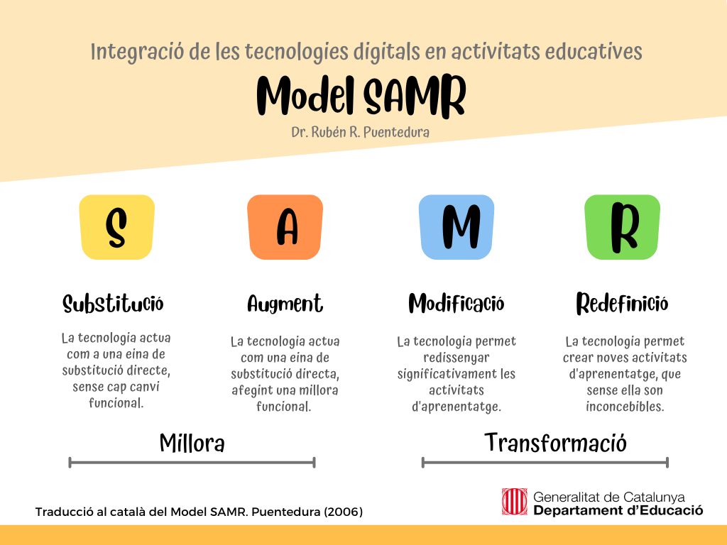 Finalment, promourem la vessant de prosumidor i els mateixos alumnes que consumeixen determinats continguts digitals (notícies, esdeveniments, xats, etc.) faran una passa endavant i seran també creadors de continguts (podcast, programa de ràdio, site). Ens endinsarem en els dos últims estadis del model SAMR sobre tecnologies digitals i treballarem el bloc de transformació: modificació (redissenyar les activitats d’aprenentatge) i redifinició (crear noves activitats d’aprenentatge).