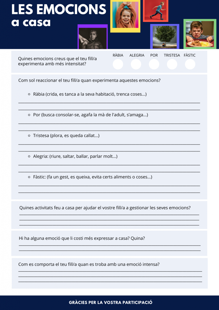 Aquest formulari té com a objectiu implicar les famílies en aquest procés educatiu, ja que creiem que l’educació emocional ha de ser una tasca compartida entre l’escola i la família. Amb la vostra col·laboració, podrem conèixer millor com els infants expressen les seves emocions a casa i dissenyar activitats que els ajudin a desenvolupar eines per gestionar-les de manera saludable.