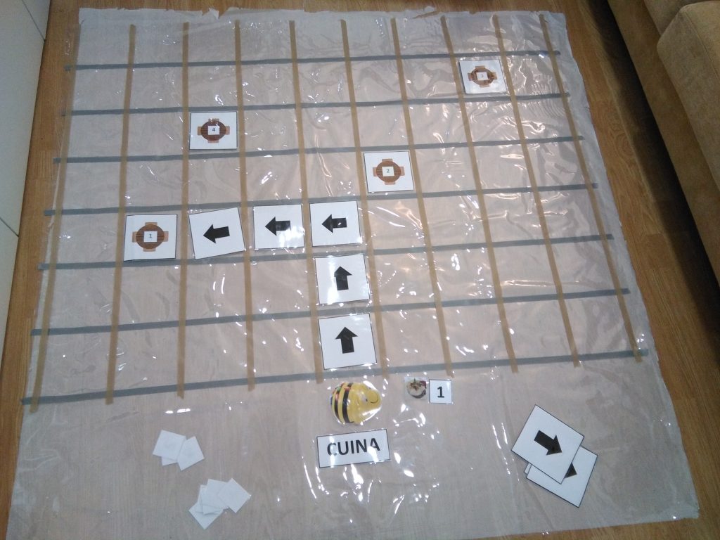 En petit grup de 4 infants 2 faran de cambrers i dos faran de clients. Després s’intercanviaran els rols. Disposen de 2 Bee-bots, una quadrícula de plàstic i dibuixos de les taules i de diferents plats de la carta del restaurant.