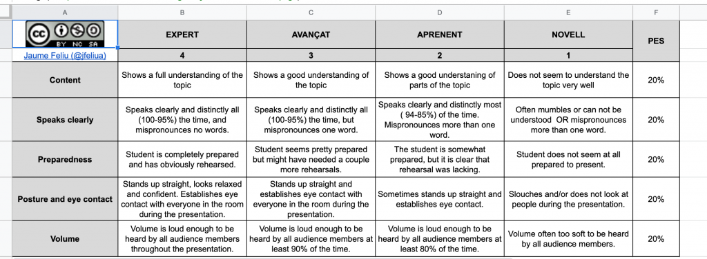 Finalment també es va fer servir una eina per avaluar anomenada Corúbrics. És una eina digital que permet crear una rúbrica i compartir amb l’alumnat per tal que ells s’avaluin de forma individual i grupal, i el mestre també avalua sobre aquella mateixa rúbrica. L’eina et dona la facilitat de crear uns percentatges a cada un del nivells d’expertesa per tal de fer una mitjana ponderada de tots els apartats i també fa la mitjana final de la valoració de l’alumne (segons la importància que prèviament el mestre ha decidit) i la valoració final del mestre.
