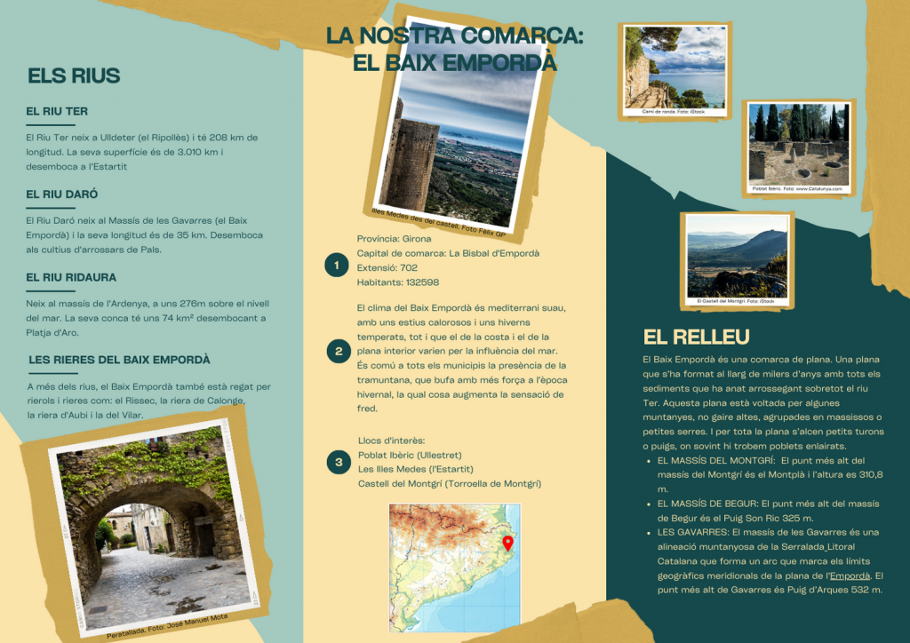 En una de les sortides programades pel parc natural del Montgrí, les Illes Medes i el Baix Ter, un grup de nois i noies descobreixen uns tríptics informatius, a la oficina del parc natural, que contenen molta informació de la què hem treballat a classe en el marc del Projecte de treball: Descobrim la Nostra Comarca.
