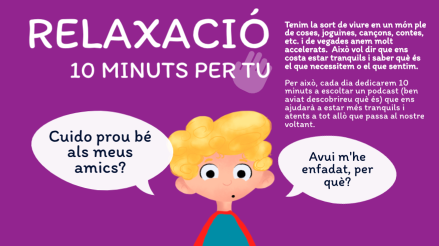 He dissenyat un organitzador visual per treballar moments de relaxació i meditació a l’aula. Partint d’un recurs educatiu obert (SX3), he organitzat un recull de pòdcasts que convida el grup classe a rebaixar la intensitat i trobar 10 minuts per conviure en un ambient més tranquil i relaxat, escoltant un àudio que fa pensar als nens i nenes i els ajuda a fer-se preguntes i qüestionar les mateixes conductes.