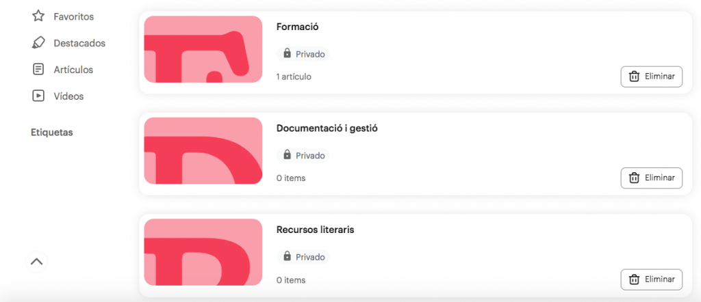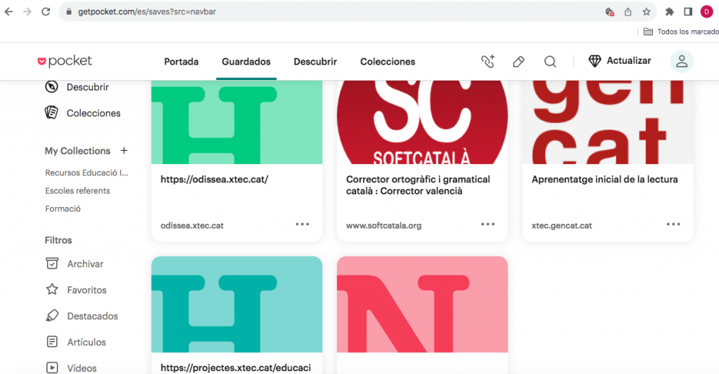 He triat afegir l’extensió Pocket com a eina que permet emmagatzemar adreces d’interès i organitzar-les per categories. Penso que és una eina molt interessant d’utilitzar, ja que permet unificar diferents àmbits d’interès, diferenciant-los entre ells (àmbit personal, professional, aficions, lectures, etc.)