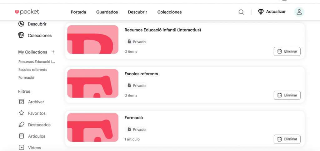 Seguidament, adjunto 3 captures de pantalla on es pot veure 5 webs educatives i també les categories diferents que he creat. A cada categoria s’hi pot trobar algun o alguns enllaços que he guardat per accedir-hi amb més facilitat.