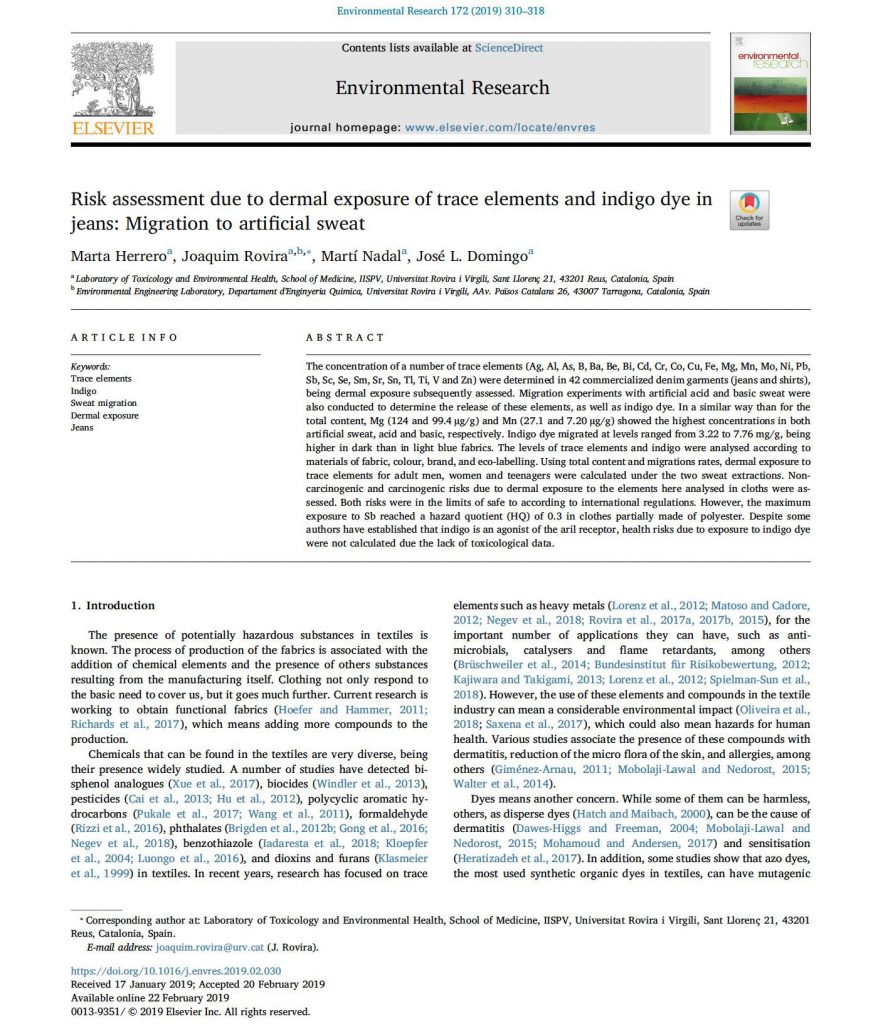 La evaluación de riesgos realizada con datos obtenidos en los estudios realizados concluye que la exposición a metales y metaloides es mayor cuanta más superficie corporal es cubierta por la ropa. El cociente de peligrosidad (HQ) utilizado para evaluar los riesgos no cancerígenos fue inferior a 1 en todos los metales y metaloides evaluados tanto para las prendas vaqueras como para la ropa de baño. Los riesgos cancerígenos para el Cr y Pb fueron admisibles en el caso de las prendas vaqueras al presentar un riesgo de cáncer (CR) inferior a 10-6. Sin embargo, en el caso de los bañadores, el Cr supera el valor aceptable en los grupos de bebés y en niñas con edades comprendidas entre los 3 y 6, y 6 y 11 ambos grupos, cuando utilizan un bañador completo.