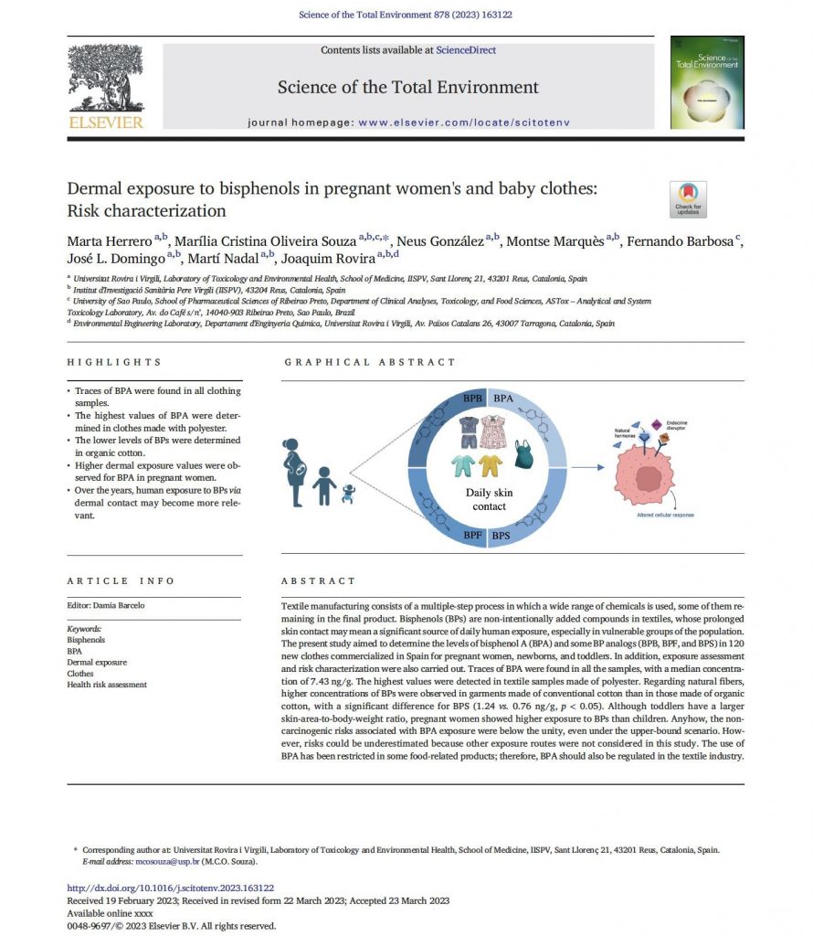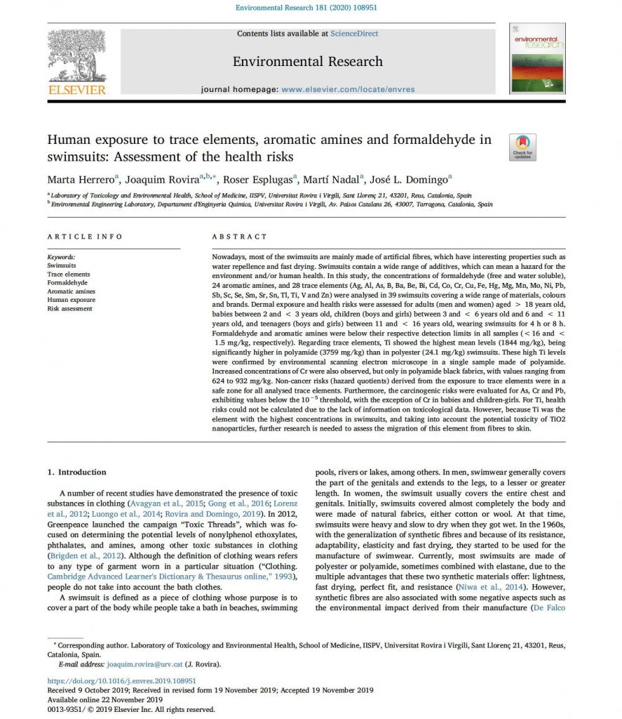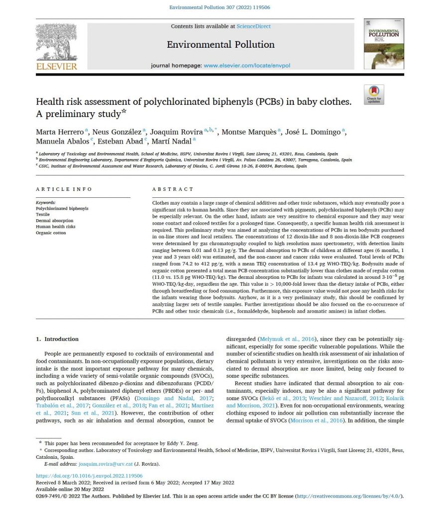 Resumiendo, a pesar de los intentos de la industria textil por reducir el uso de sustancias tóxicas en sus procesos de producción, la presencia de sustancias tóxicas en las prendas de vestir es difícil de ignorar. Además, esta presencia está asociada al tipo de fibra, siendo las fibras de algodón las que más formaldehído contienen, Sb, BPA y BPS serían mayoritarios en las fibras de poliéster y el Ti en las fibras de poliamida. El color también influye en estos niveles siendo las prendas de colores oscuros las que contienen niveles más altos de Mg, Cr, Cu y Pb, BPS. Los PCBs serian mayoritarios en las prendas de tonalidades amarillas y el BPA en las prendas de color gris. Desgraciadamente, las prendas fabricadas con algodón orgánico no están libres de sustancias tóxicas ya que algunas contienen niveles más altos de metales y formaldehído. En términos generales la evaluación de riesgos es positiva, exceptuando a los grupos de población de bebés y niñas con edades comprendidas entre los 3 y 6 años, en los que el CR fue ligeramente superior al umbral para el Cr (VI).