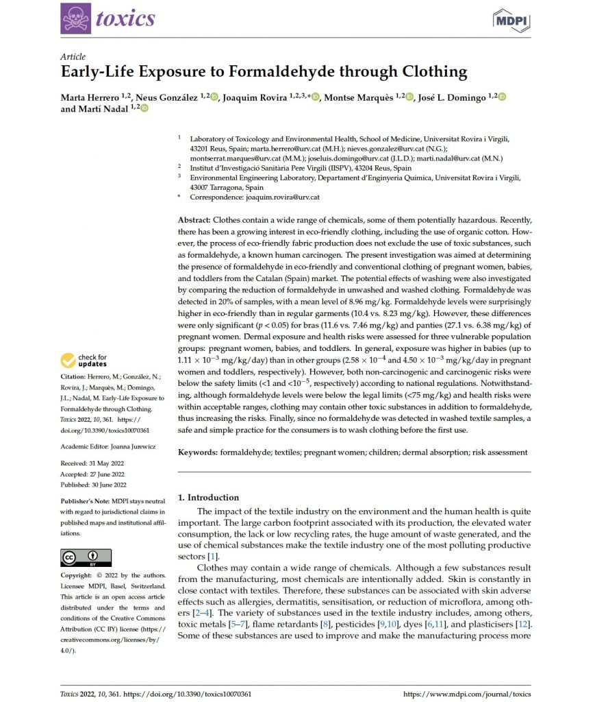 La presencia de sustancias químicas en la ropa ha sido objeto de estudio en los últimos años. Ésta se debe al uso de las mismas durante las diferentes etapas de fabricación de los tejidos y/o como resultado de la propia fabricación. Además, las prendas de vestir hoy en día no sólo responden a la necesidad básica de cubrir el cuerpo. Actualmente se busca cubrir unas demandas del mercado muy específicas como por ejemplo prendas de fácil planchado, resistentes al calor, impermeables, que protejan contra los rayos UV… incluso ya se está investigando en prendas funcionales. Y todo ello es posible gracias al uso de sustancias químicas. Desgraciadamente, el uso de alguna de estas sustancias químicas resulta tóxico tanto para el medio ambiente como para los seres humanos. Sus efectos negativos en la salud humana abarcan desde pequeñas y puntuales reacciones cutáneas, dermatitis hasta algunos tipos de cáncer.
