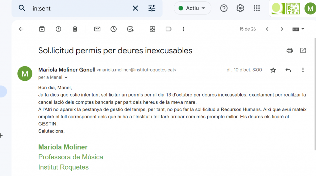 En la segona comunicació es pot veure com ens comuniquem internament el professorat amb els òrgans de govern. Aquesta comunicació es duu a terme mitjançant el correu corporatiu de centre.