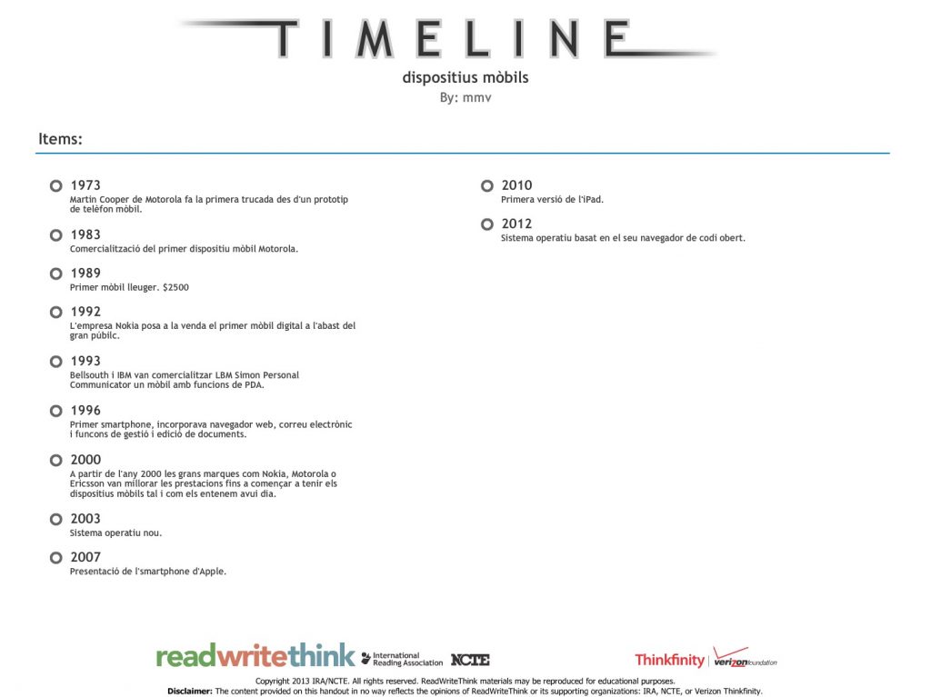 Vaig trobar interessant poder aprofitar la reflexió del mòdul 5 per utilitzar alguna App desconeguda.  Com que el que més m’ha cridat l’atenció del mòdul 5 és l apart de la història dels dispositius mòbils, he buscat una App per fer un fris cronològic. aixií doncs, he utilitzat una App cercada a través de ToolboxRWT Timeline.