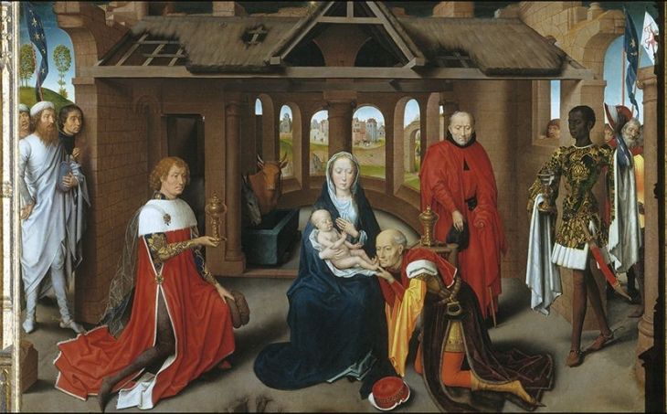 Savis que la iconografia flamenca del segle XV convertiria en tres reis vinguts d’Europa, Àsia i Àfrica, amb fisonomies clarament lligades a cada un dels tres continents coneguts fins al moment. És amb aquesta obra de Hans Memling, ‘L’Adoració dels Reis’, que es conserva al Museo del Prado, que s’inaugura la tradició iconogràfica del rei negre. Carles el Temerari i Felip el Bo, ducs de Borgonya, van encarregar al pintor aquest tríptic [a la imatge, la taula central] que havia de decorar l’abadia de Ten Duinen i, com a donants, no van tenir objeccions a exhibir-se com els mateixos Reis d’Orient, clarament recognoscibles —agenollats davant Jesús— perquè Memling era un expert retratista. El pintor mateix no perd l’ocasió de presenciar la fascinant escena i s’autoretrata observant-la des de la finestra.