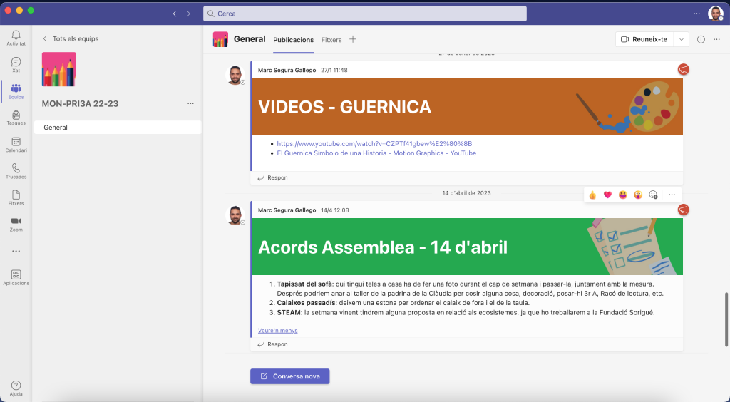 Aquesta evidència, tot i que és breu, és una forma molt útil de comunicació amb l’alumnat de la classe. L’eina utilitzada és un entorn virtual d’aprenentatge, concretament el Microsoft Teams. És una plataforma tancada on només s’hi pot accedir amb el correu d’alumne de l’escola.