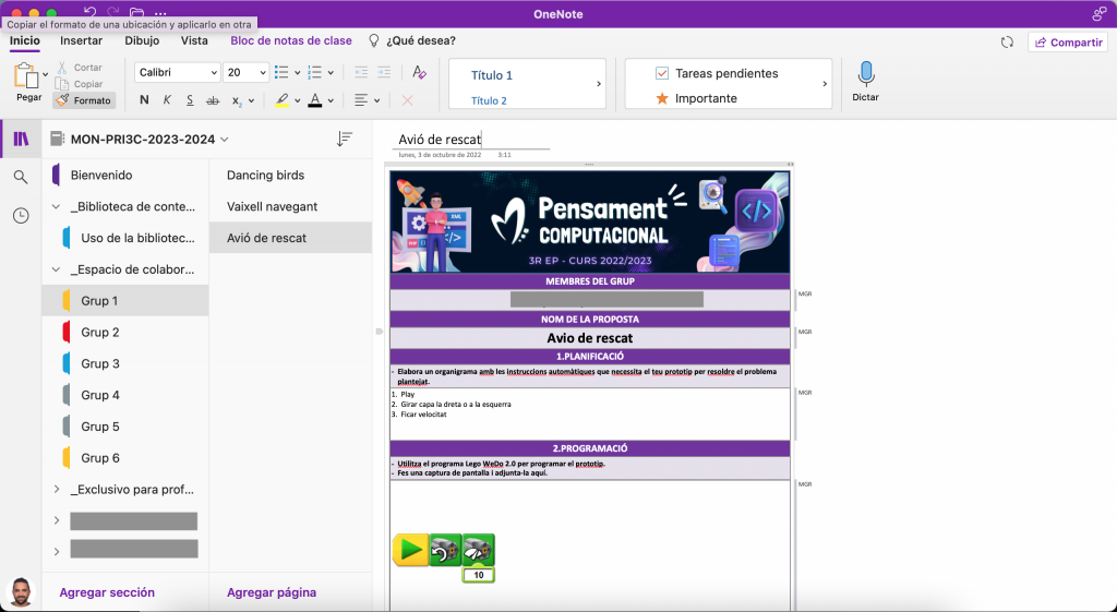 El One Note, és un portfoli que a l’equip de mestres i als mateixos alumnes ens serveix per veure el progrès que van fent en el desenvolupament del pensament computacional.