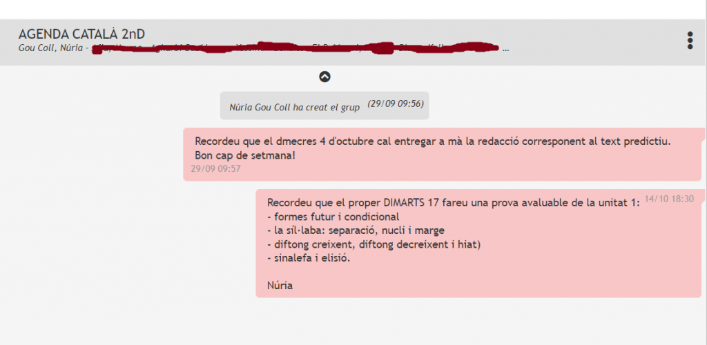 El primer exemple de comunicació és un grup de missatgeria que he creat amb l’alumnat del grup-classe 2nD d’ESO. Es tracta, per tant, d’una comunicació amb l’alumnat.