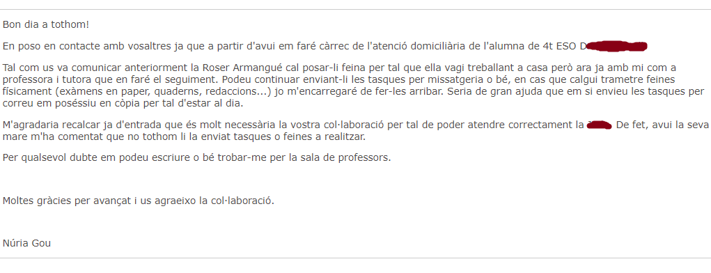 El segon i darrer exemple de comunicació és un missatge al professorat, concretament a l’equip docent d’una alumna d’atenció domiciliària.