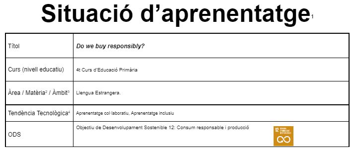 A continuació us presento la situació d’aprenentatge que he redissenyat. En el meu cas, he redissenyat una SdA de quart de primària sobre el consum que fem, si és responsable o no. A part que la SdA és de quart de primària, cal destacar que es treballa a l’àrea de Llengua Estrangera (Anglès). A més a més, s’enquadra en el treball dels Objectius de Desenvolupament Sostenible (ODS), concretament en el número 12: Consum responsable i producció.