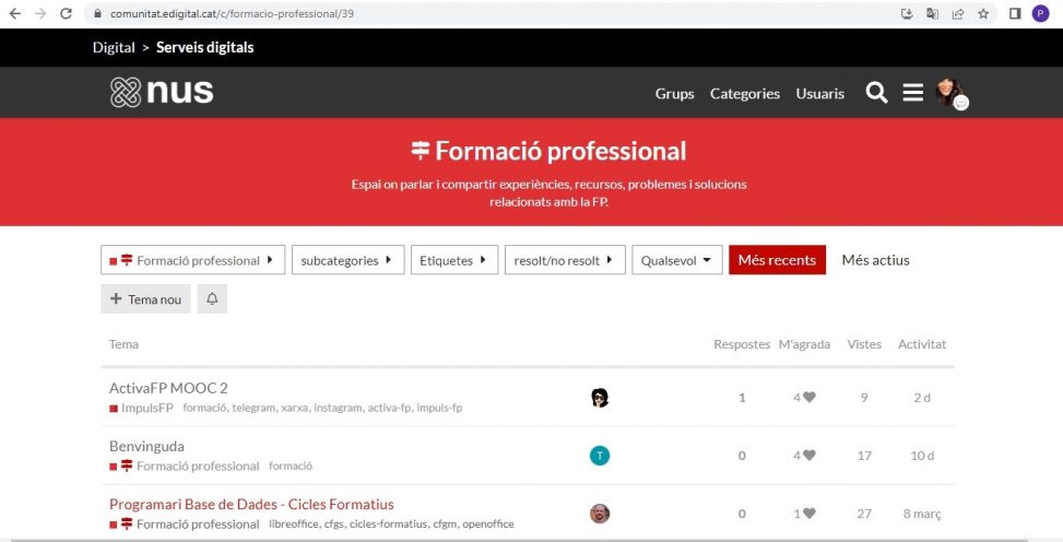 El NUS ens ofereix un espai de conversa entre companys i companyes docents, un lloc on compartir experiències, dubtes i solucions. Podem trobar grups diversos i podem unir-nos a aquells que ens interessin.