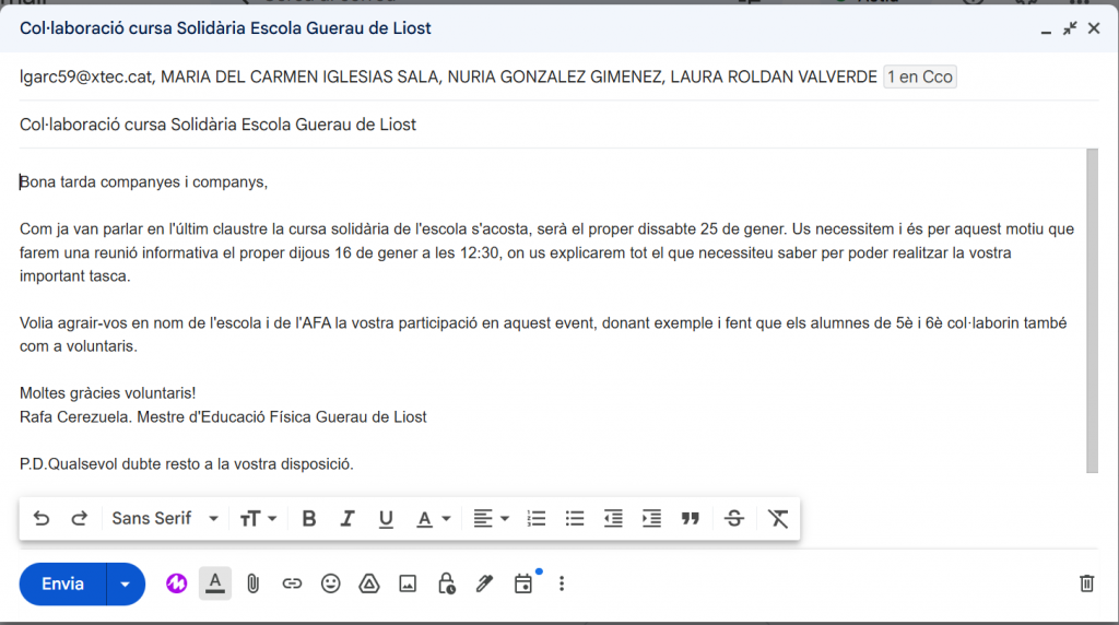 La segona ha estat mitjançant un correu electrònic a 4 companyes del centre per l’organització d’una cursa solidària a l’escola. He posat com a còpia oculta el correu de l’escola per informar a l’equip directiu de la reunió.