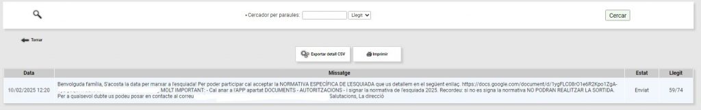 Pel que fa a la comunicació amb les famílies, s’ha fet servir EduGestió, una plataforma oficial del centre destinada a la comunicació administrativa i pedagògica. Aquesta eina ha estat triada per la seva capacitat per garantir la confidencialitat de les dades personals i per facilitar una transmissió eficient d’informació rellevant. En aquest cas, la plataforma ha permès compartir amb les famílies detalls sobre una sortida escolar, proporcionant indicacions precises sobre els passos a seguir per a l’autorització de la participació de l’alumnat. Aquesta estratègia comunicativa assegura que la informació arribi de manera clara i estructurada, facilitant-ne la comprensió i la correcta gestió dels requisits administratius.