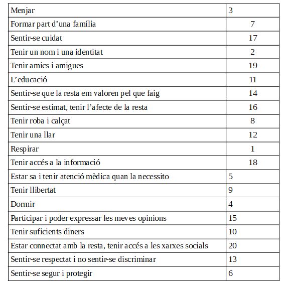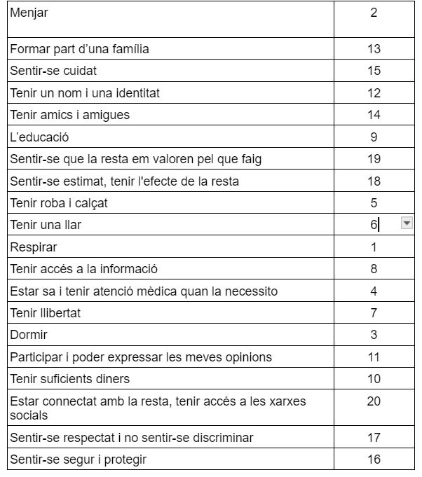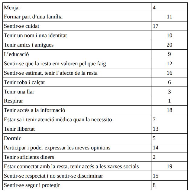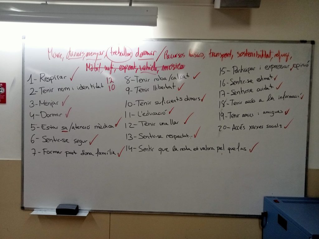 Un cop transcorreguts els minuts de debat un dels grups ha anotat la seva relació de necessitats a la pissarra i ha iniciat el debat conjunt. Tots els grups han estat d’acord que les necessitats fisiològiques són les primeres i imprescindibles per a optar a qualsevol altre, i a partir d’aquí encara que ha hagut discrepàncies sobre la situació dels diners, la salut i tenir una llar, s’ha construït una reflexió molt interessant sobre les necessitats afectives. Per últim tots els grups han coincidit en que l’accés a les xarxes socials ha d’anar en el lloc 20.