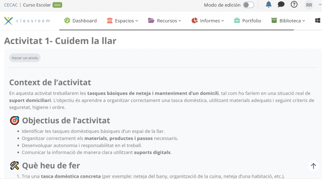 L’activitat forma part de la Situació d’Aprenentatge “Cuidem la llar”.