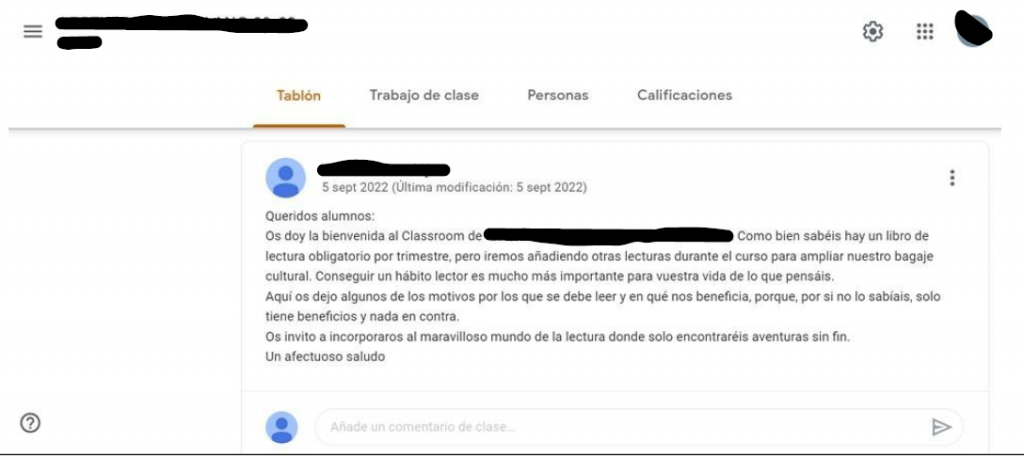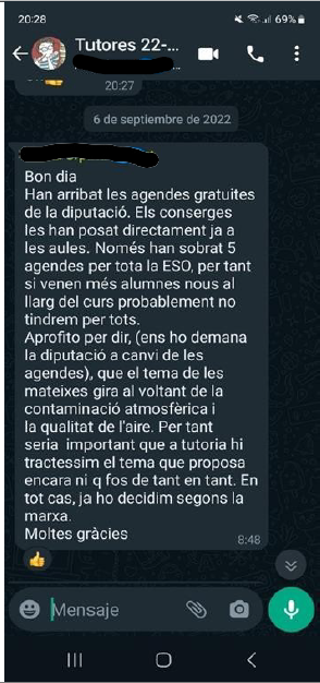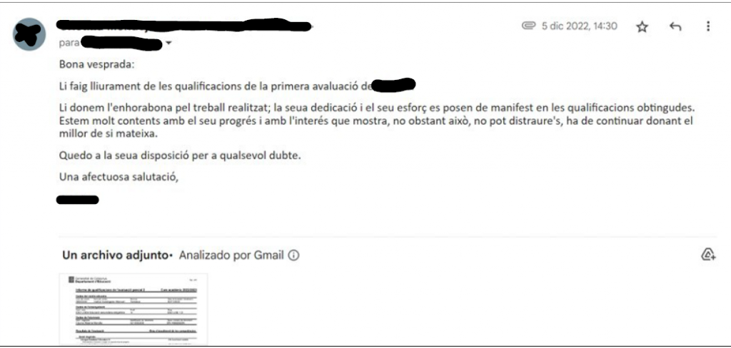 | Comunicat a l’alumnat És un comunicat en el Tauló del Classroom de la matèria. Només ho veuen els alumnes i el professor. A més, en el Classroom no hi ha informació personal, per tant, la protecció de dades està assegurada. El Classroom és un lloc que ells veuen amb freqüència perquè l’utilitzen en totes les matèries de nivell (no hi ha diversificació de plataformes utilitzades entre professors), ho consulten quan fan deures o quan treballen, afavorint uns límits en l’ús de la pantalla i així el seu benestar digital i emocional. Comunicat per a les famílies He posat dos exemples: un comunicat a les famílies a través de la pàgina web del centre i missatge de correu electrònic. El comunicat a les famílies en la pàgina web no interfereix en el dia a dia, consultes la pàgina quan vols i no s’exposen les dades personals de ningú. En el correu electrònic a una família, és un correu personal amb informació confidencial de la seva filla, correu que s’envia de manera confidencial amb la finalitat de protegir les dades que s’exposen. Comunicació per a docents Comunicació en el xat de whatsapp de Tutors. Com a mesures per a la protecció de dades i seguretat física i benestar emocional, no s’exposen públicament dades confidencials i no s’utilitza vocabulari que pugui resultar agressiu o violent per a assegurar la correcta convivència i mantindre el respecte. Per a tots els comunicats com a mesures de protecció de dades i seguretat física i psicològica i benestar emocional porto a terme les següents mesures: – Tinc tots els meus dispositius actualitzats. – Disposo d’antivirus i vaig amb compte amb les aplicacions que instal·lo i les pàgines que he visitat . – Procuro de tenir contrasenyes segures. – No utilitzo xarxes públiques per a fer comunicacions i sempre utilito una wifi xifrada. – No utilitzo ordinadors que no són meus. – Procuro enviar comunicacions i correus en horaris laborals per a no interferir en el temps lliure de companys, famílies i alumnes, promovent d’aquesta manera una millor conciliació familiar i laboral. |