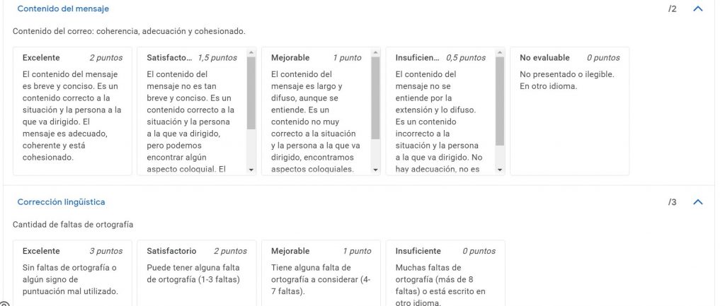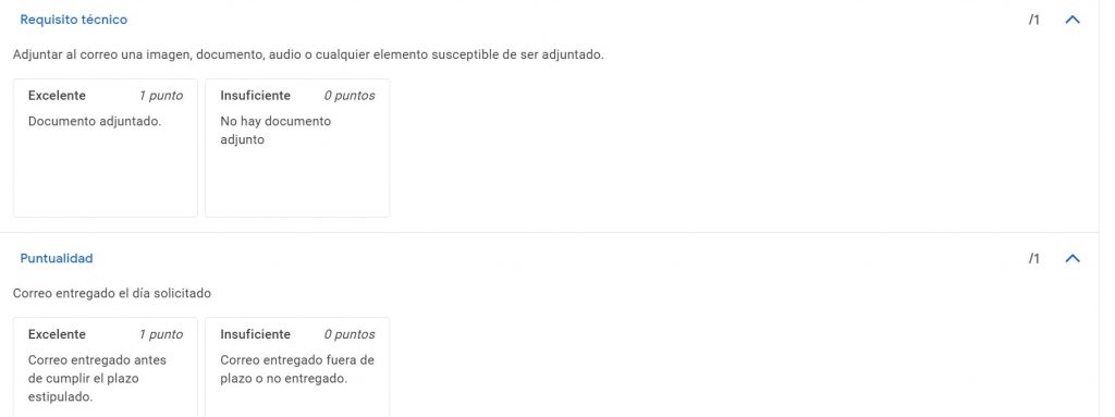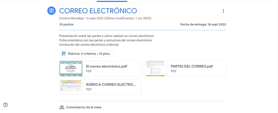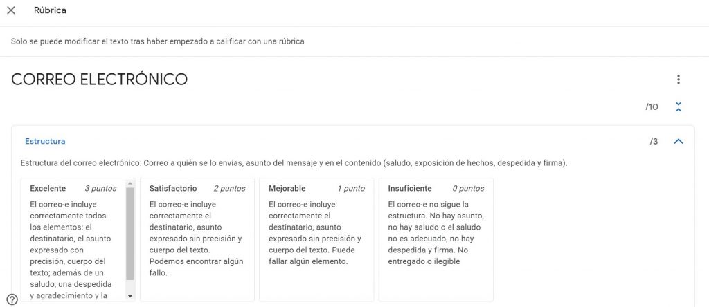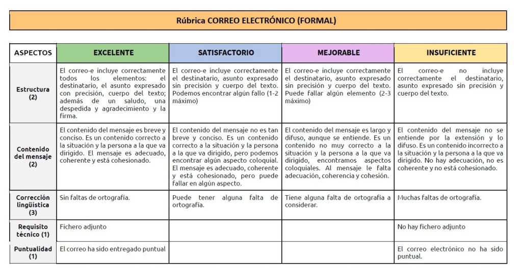 Utilitzo en les meves classes la plataforma de Classroom, la qual permet inserir rúbriques per a avaluar, que resulten molt útils. Per al següent exercici incloc una rúbrica del correu electrònic amb la qual he avaluat en la plataforma i que he enviat als alumnes.