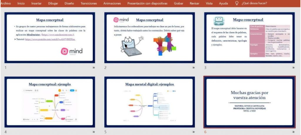 - La primera activitat es tractava de fer un mapa conceptual amb ‘Mindmeister’ sobre les classes de paraules en castellà vistes al llarg de 1r ESO. En cada classe de paraula havien de posar una definició, els tipus i exemples.