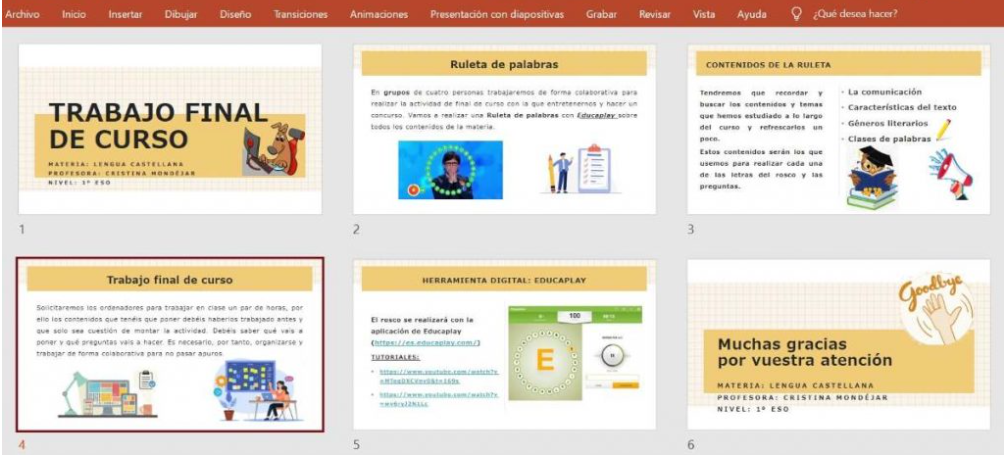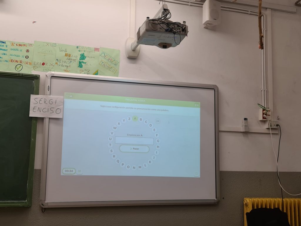 - La segona activitat es tractava de fer una ruleta de paraules (Pasapalabra) en l’aplicació d’Educaplay, amb tots els continguts del curs observats fins ara (la comunicació, gèneres literaris, classes de paraules, gramàtica, ortografia, la narració, el teatre, el text i les seves característiques, tipologia textual).