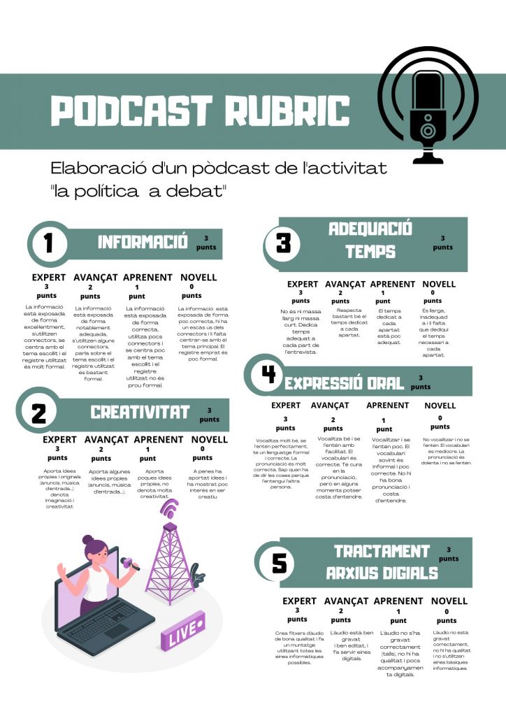 En l’activitat que torno a reproduir a continuació sobre elaborar un pòdcast que inclogui un debat sobre política he emprat dues maneres per elaborar la rúbrica, amb el CANVA.