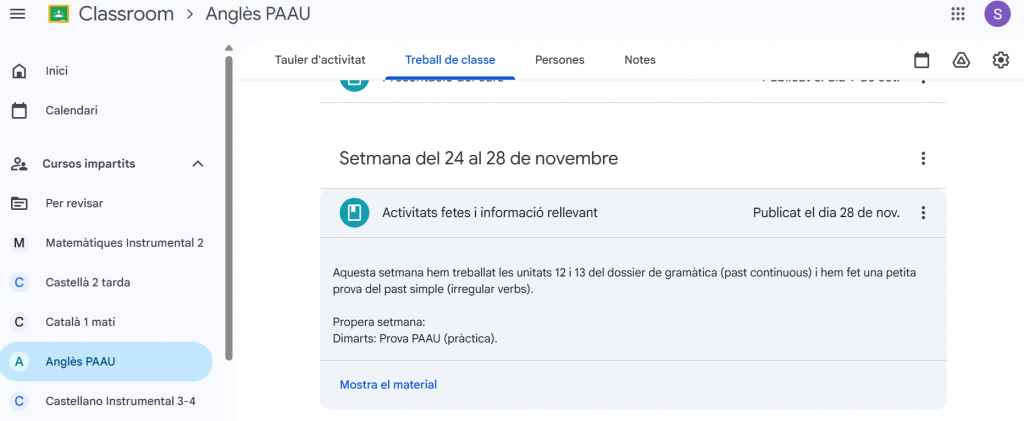 Fent servir l’eina digital recomanada a l’EDC, setmanalment utilitzo el Classroom per comunicar-me amb el meu alumnat. Aquesta eina em permet comunicar els continguts treballats al llarg de la setmana i anticipar allò que farem properament. A més, també comparteixo materials i enllaços digitals que permeten el treball de manera autònoma per part de l’alumnat.