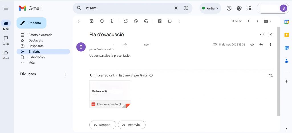 Com a coordinadora en PRL al meu centre, vaig fer una petita presentació del pla d’evacuació que realitzarem al nostre centre educatiu en les properes setmanes. Després d’haver fet la presentació, vaig compartir-la amb tot el professorat per tal que tot l’equip docent tingués accés a la informació aportada. Per tal de fer aquesta comunicació, vaig utilitzar el correu coorporatiu del centre i vaig enviar la presentació en PDF a tot l’equip docent, utilitzant l’usuari: professorat@xxxxxxxxx.net. Per tal de protegir les dades sensibles, la captura de pantalla ha estat modificada, esborrant totes aquelles dades personals necessàries.