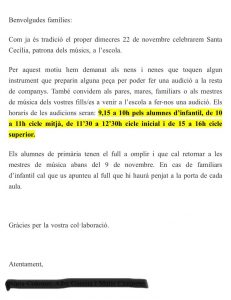En aquest missatge l’escola informa de la celebració de Santa Cecília la patrona de la música el dia 22 de novembre.